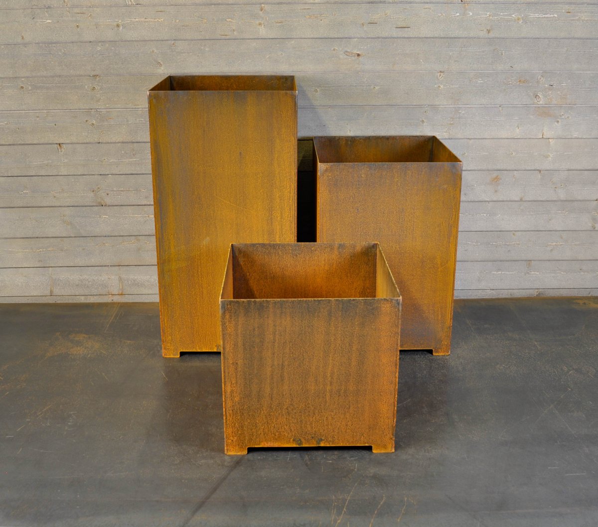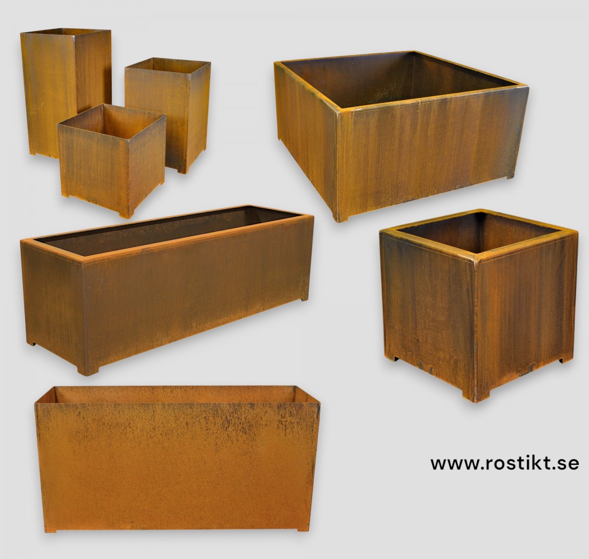 Våra produkter av Cortenstål levereras plåtrena och rostar först när dom är utomhus.